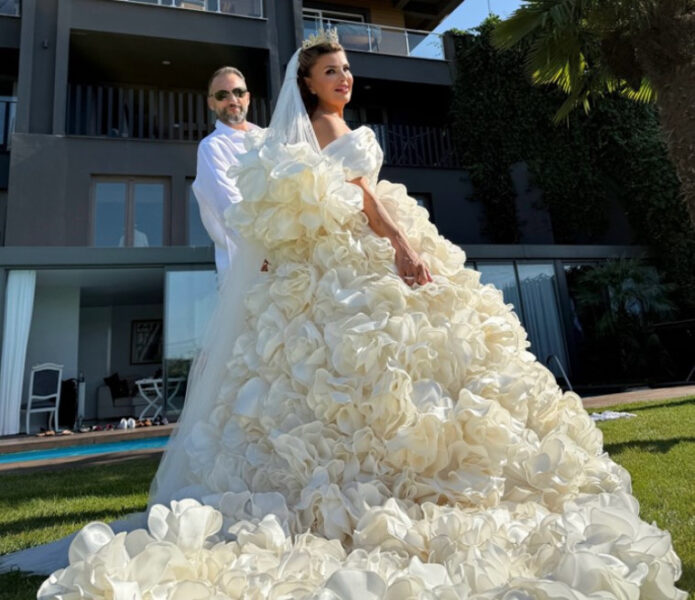 Nuray Sayarı’nın seçtiği kabarık, üç boyutlu çiçek aplikeleriyle süslenmiş gelinlik adeta bir moda şovunu aratmadı. Uzun duvak ve kat kat tüllerle tamamlanan prenses model tasarım dikkat çekti.